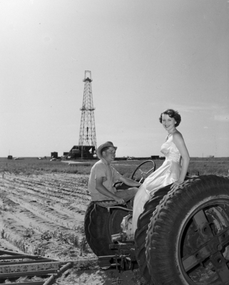 New hot spot of west Texas oil development is Brownfield in Terry County, where new money is pouring in. Paul Hungerford admires Harvest Queen Ann Snedeker in shadow of the Union Oil Company No. 1, Laura Cotten, newest Terry discovery. Published in Fort Worth Star-Telegram morning edition August 27, 1950.