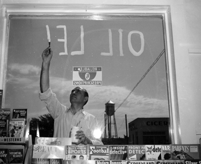 New hot spot of west Texas oil development is Brownfield in Terry County, where new money is pouring in. Pharmacist H. W. Nelson, owner of 400 acres, paints an "Oil Lease" on window near crowded clerk's office. Published in Fort Worth Star-Telegram morning edition August 27, 1950.
