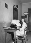 New hot spot of west Texas oil development is Brownfield in Terry County, where new money is pouring in. Mrs. Truman Dubose, employee of County Clerk H. M. Pyeatt, transcribes lease in hall near crowded clerk's office. More than 4,200 instruments have been recorded. Published in Fort Worth Star-Telegram morning edition August 27, 1950.