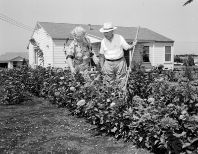 Mr. and Mrs. Hugh Small stand amid the hundreds of zinnias in their garden at 5813 Locke. Published in Fort Worth Star-Telegram morning edition August 27, 1950.