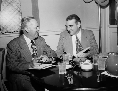 A "fair shake" for West Texas in redistricting was pledged here by Ben Ramsey, left, candidate for lieutenant governor, shown as he ate breakfast with Roy Loventhal, chairman of the Texas Livestock Sanitary Commission. Published in Fort Worth Star-Telegram evening edition August 23, 1950.