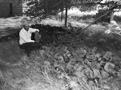 Sheriff Sid Reeder, left, checks number on drilling bits recovered in a pasture near Gail in Borden County. Published in Fort Worth Star-Telegram morning edition September 3, 1950.