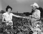 Mr. and Mrs. W. L. Wilson Junior, who own two sections near the East Vealmoor pool in southern Borden. They are photographed in the very acres they own showcasing the produce that grows on it. Published in Fort Worth Star-Telegram morning edition September 3, 1950.