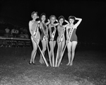 These are the five girls who, at La Grave Field, qualified for the finals of the "Miss Cat" contest. They are, left to right, Yvonne Bevil, Jimmie Twoomey, June Farmer, Joe Helen Fanning, and Beverly Wren. Members of the Cat baseball team did the judging. Published in Fort Worth Star-Telegram evening edition August 25, 1950.