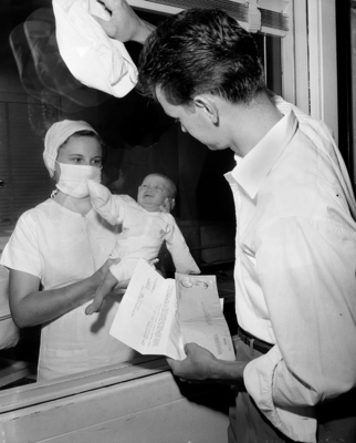 Image shows William P. Davis, right, looking through a window at a nurse who is holding his newborn son. Davis received his orders to report for active duty in the Navy the day before his son's birth at Harris Hospital. Published in the morning edition, August 25, 1950.