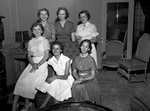 The sextet of collegians pictured here lunched together. They are from left to right, seated, Misses Nancy Hall, who will attend Agnes Scott College, Judy McVeigh, attending SMU (Southern Methodist University), and Gail Potts, attending Vassar College. Standing, from left to right, is Misses Kitty McDonald, attending UT (University of Texas), Mary Lou Brown, attending Rice University, and Nancy Jary, also attending UT.
