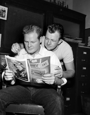 Captains Clarence (Red) Marable, left, and Charley Jackson of Texas Christian University (TCU) Frogs reported for start of practice. Marable, tackle, is from Waco; Jackson, back, from Denison. Both were seniors. Published in Fort Worth Star-Telegram evening edition August 25, 1950.