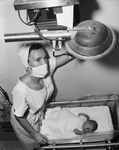 Image shows Mrs. Gladys Bowles, a nurse and supervisor of the nursery at Saint Joseph's Hospital, as she photographs the infant daughter of Mr. and Mrs. J. E. Judge of Keller. The little girl is named Eddie Lou Judge. Published in the morning edition, September 8, 1950.