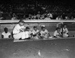 Image shows six members of Fort Worth Cats in dugout. From left to right, Tommy Tatum, Clarence Podbielan, Ed (Red) Borom, Fred Storck, John Rutherford and Pat McGlothin. At far left is possibly the club's trainer, Alec Thomas. They are shown laughing at Beaumont Catcher Clint Courtney just before he went down swinging in sixth inning. Published in the Fort Worth Star-Telegram morning edition, August 27, 1950.