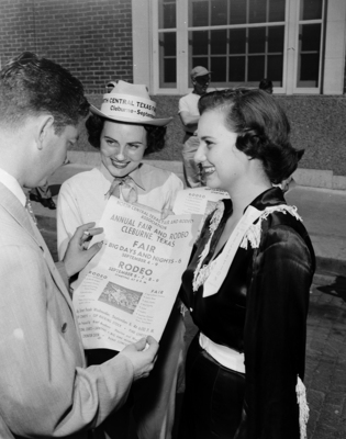 Jane Barker, center, and Betty Rawland, both of Cleburne, try to "sell" Don Gorton, of Hotel Texas, on the idea of attending the Cleburne rodeo and fair. Published in Fort Worth Star-Telegram morning edition August 27, 1950.