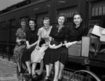 These Hardin-Simmons University co-eds will ride white horses and carry Texas flags in the Veterans of Foreign Wars parade in Chicago. Left to right, Mina Matthews, Jackie Fletcher, Sue Rose, Doris Reid and Jonnie Delle Brock. Published in Fort Worth Star-Telegram morning edition August 27, 1950.