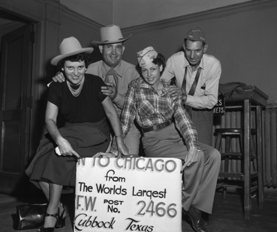 Mrs. Hardy Rampy and her husband, left, and Mr. Vernon R. and Mrs. Oma Lee Gilmore, representing Lubbock Post 2466, Veterans of Foreign Wars, left Fort Worth aboard the Texas Chief for the Veterans of Foreign Wars (VFW) national encampment in Chicago. Published in Fort Worth Star-Telegram morning edition August 27, 1950.