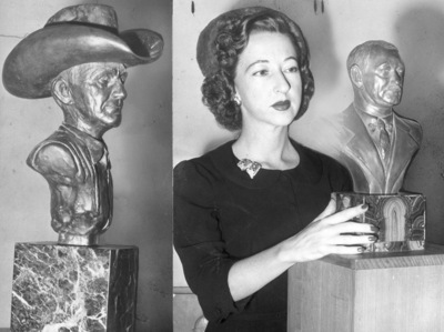 Mrs. Electra Waggoner Biggs with two sculpted busts 01-18-1950