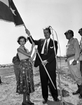 Massed colors of 36th Division units, with battle streamers flying from regimental standards, stand before the reviewing stand at North Camp Hood as Nancy Cunningham, and other Austin Future Homemakers, present hand-made Texas flags through Governor Shivers to the units. Published in Fort Worth Star-Telegram morning edition August 27, 1950.