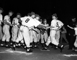 Image shows Fort Worth Cats team rush to Fred Storck (5) as he strides across the plate after hitting his ninth inning home run to beat Beaumont. From left to right , Frank Brown, Fred Waters, Ed Borom, Ken Staples, and Mike Lemish. Published in the Fort Worth Star-Telegram morning edition, August 28, 1950.