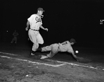 Image shows Dee Fondy safe at first base in eighth inning game at La Grave Field. Fondy forced Joe Torpey, right, at second base but Beaumont Shortstop Jack Cusick threw low past First Baseman Joe Sabtella. Beaumont won, 6-4. Published in the Fort Worth Star-Telegram evening edition, August 29, 1950.