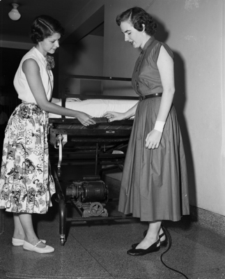 The proceeds of a benefit performance of the Follies, given by the Fort Worth chapter of Delta Beta Sigma Sorority, were used to gift a new rocking hospital bed for the polio ward of the City County Hospital. Miss Susie McCullock, left, president of the sorority, and Miss Mary Lou Brown, right, treasurer, are shown placing a plaque on the bed. The ben motorized to help aid in circulation and breathing, is the first of its kind to be used in the in City County Hospital. Published in the evening edition, August 29, 1950.