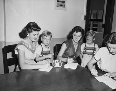 Two sets of twins. Miss Jane Treadaway, left, and her sister Jean, center right, both of Dallas, both came to Fort Worth as they start their teaching careers. The sisters are shown helping a younger set of twins, Jerry (left) and Terry Shoaff, fill out papers as the boys prepare to enter first grade. The boys are the sons of Mr. and Mrs. M. F. Shoaff, of 1312 South Lake. Published in the evening edition, August 29, 1950.