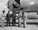 Brigadier General C. S. Irvine, second from right, is shown handing the keys to the Air Force's first B-36D to Lieutenant Clarence F. Horton Jr. of San Antonio. Horton's crewmen, headed by Master Sergeant Matt Sarich of Roundup, Montana, showed "best progress in training," according to the 26th Squadron commander, Lieutenant Colonel Howard F. Hugos. Left to right, are Colonel T. P. Gerrity, 11th Bomb Group commander; Sarich, Horton, Irvine, and Hugos. Published in the evening edition, August 29, 1950.