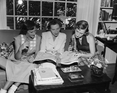 Mrs. Harry B. Milner, center, of 2509 Stadium Drive, is shown with her daughters, Joan right, and Elizabeth, left. The women consider themselves "Texans by adoption" and regret having to move back to New York with Mr. Milner. Published in the morning edition, September 3, 1950.