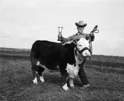 Burguess Stewardson, 13, son of Mr. and Mrs. W. T. Stewardson of Santa Anna, poses his 810-pound Hereford which was named grand champion steer of the Coleman Livestock Show. The animal was bred by Winston Brothers, Snyder.