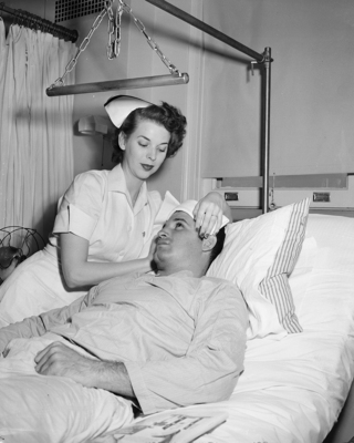 Mr. Milton Farmer, a Texas Christian University (TCU) football player from Graham, is shown resting in a hospital bed after an operation on his leg at Harris Hospital. Standing next to him on the left is nurse Mrs. W. E. Palmer. Published in the evening edition, August 30, 1950.