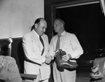 Jimmy Jay, right, long active in the affairs of the Laneri High School Boosters Club, was rewarded for his deeds when Frank Crumley presented him with a pair of boots on behalf of the club's members. Published in the morning edition, August 30, 1950.