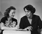 Mrs. Frank Kelly, left, president of the "Fort Worth Council for Mentally Retarded Children", is shown conferring with Mrs. B. W. Knight, who would begin to teach a special education class at DeZavala Elementary School in the coming months. Published in the evening edition, August 31, 1950.