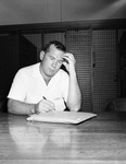 Six City Conference coaches were on the listening end as Athletic Director Herman Clark gave last minute instructions. Photographed here is one of coaches, representing Amon Carter Riverside School, coach Bobby Sherrod. Published in Fort Worth Star-Telegram morning edition August 30, 1950.