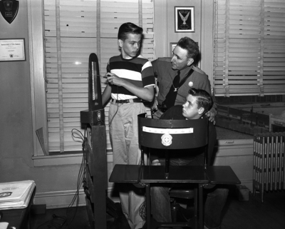 Sergeant C. H. Cheshire, a former student at Laneri High School and now a member of the Texas Highway Patrol, checks the aptitudes of two Laneri High boys who are taking the accredited driver's training course offered at their school. They are Charles Carter, left, and Don Roberts.