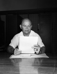 Six City Conference coaches were on the listening end as Athletic Director Herman Clark gave last minute instructions. Photographed here is Athletic Director Herman Clark while giving his speech. Published in Fort Worth Star-Telegram morning edition August 30, 1950.