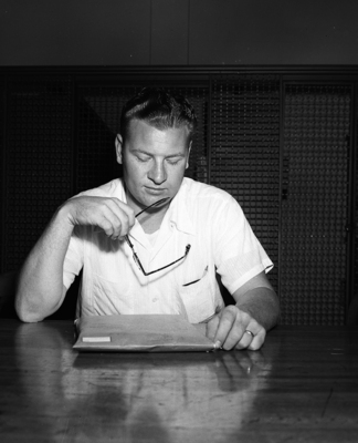 Six City Conference coaches were on the listening end as Athletic Director Herman Clark gave last minute instructions. Photographed here is one of coaches, representing North Side School, coach Kenneth Gire. Published in Fort Worth Star-Telegram morning edition August 30, 1950.