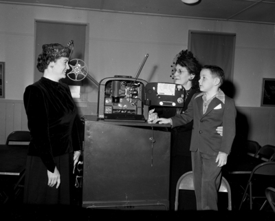 Mrs. David E. Sloan of 3704 Harley, left, president of the Thomas Place School's P-TA, presents a movie projector to Miss Christmas, a teacher, right, and Ronnie Butterfield, in behalf of the P-TA.