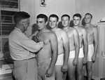 Image shows five Arlington Heights Highschool Students being examined by Dr. I. P. Barrett, to ensure that they are fit for the football season. Left to right, are Dr. Barrett, Bob Miller, Claude Roach, Billy Stephenson, Don Ellis, and Ken Harlow. Published in the morning edition, August 31, 1950.