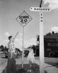 Image shows Austin Elementary School students Sidney Cockrell, left, and Betty LaJuan Beard, right, looking toward one of the new School Zone signs that were recently placed all over Fort Worth. Published in the evening edition, September 5, 1950.