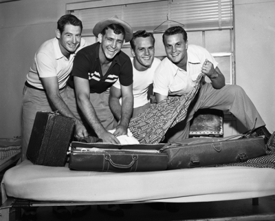 Prepared for football practice the following week, students Homer Tompkins, Bill Moorman, Gilbert Bartstosh, and Max Eubank, shown left to right, unpack their bags at Texas Christian University's Tom Brown Hall. Published in the morning edition September 1, 1950.