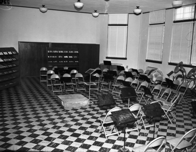 Image is of the music room at the Arlington Heights annex, which features music shelves, uniform cabinets and acoustical ceiling and wall. Published in Fort Worth Star-Telegram morning edition September 14, 1950.