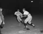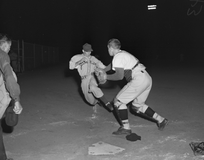 Averett Duffy of Jim Hill Produce finds Karlen Brothers Catcher John Ligon waiting for him with the ball as he tries to score in fourth inning of TAAF playoff tilt at Rockwood Park. Published in Fort Worth Star-Telegram evening edition September 1, 1950.