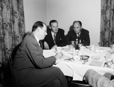 Dr. Rhea H. Williams, foreground, athletic director of the Texas Interscholastic League (TIL), discusses plans for City Conference state basketball tournament here with Rodney James (Captain) Kidd, TIL director, and Herman Clark, city schools athletic director, left to right in background.
