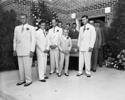 The funeral of W. A. Hawkins, 66, Bridgeport funeral director who died on the 29th of August, was conducted by his four sons, all morticians at the First Baptist Church of Bridgeport. From Left to right are Leon Hawkins, Jack Hawkins, Paul Hawkins, Bobby Hawkins, 10, son of Bert Hawkins, and Bert Hawkins. Published in the morning edition, September 1, 1950.