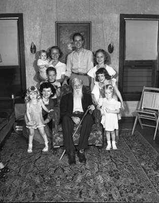 John J. (Uncle Johnny) Ray, to celebrate his 105th birthday, is shown surrounded by his great-grandchildren. Left to right, surrounding Mr. Ray, are Donna Jean Ray, 3; Mrs. J. R. Ray, a granddaughter-in-law; Bobby Ray, 6; Roger Ray, 1, in the arms of Mary Rue Miller, 14; Roy Miller Jr., 20; Marjorie Miller, 12; Judith Ann Ray, 7; and Mary Carolyn Johnson, 3. The photo was taken at the birthday party of Carolyn, who shares a birthday week with her great-grandfather. Published in the evening edition, September 1, 1950.