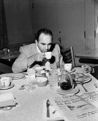 American gangster Mickey Cohen was brought to Fort Worth from Wichita Falls and escorted to the first Los Angeles bound plane. Cohen left the state with a threat to sue the Texas Rangers for "giving him the bum' rush" by forcing him to leave. The image shows Cohen sitting at a table, eating. Published in the evening edition, August 31, 1950.