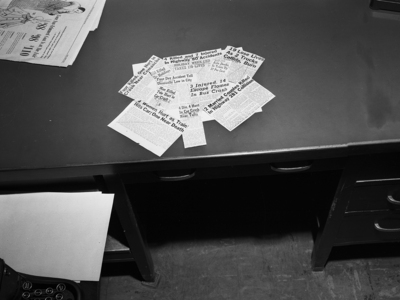 Image from the Star-Telegram's reference room, of a collection of newspaper headlines spread out on a desk. All of the headlines related to car accidents and fatalities, and were gathered and published as "grim reminder" to drive safely, sanely, and carefully over the upcoming Labor Day weekend. Published in the morning edition, September 2, 1950.