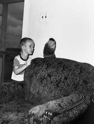 Jack Wayne Beard, age 4, is shown looking at his pet monkey, Cheechee, upon her return home after having gotten out. The monkey's escape had led to a four-hour chase in Polytechnic. Published in the morning edition, September 1, 1950.