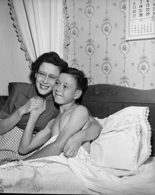 Image shows Mrs. J. P. Alexander, left, with her son, Lewis Wayne Alexander, right, after a close call in which Lewis, 12, almost drowned in the river near his River Oaks home. Published in the morning edition, September 1, 1950.