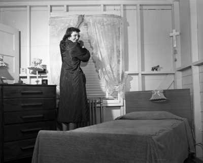 Image shows Private First Class Marcella Grossman, one of the members of the 4005th Women's Air Force Squadron at Carswell Air Force Base. Grossman, of Petoskey Michigan, is shown putting the finishing touches on curtains in a barracks room. Published in the morning edition, September 10, 1950.
