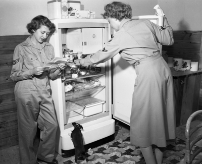 Image shows Private First Class Helen Stevenson, right, one of the members of the 4005th Women's Air Force Squadron at Carswell Air Force Base. Stevenson, of Abington Virginia, is shown getting a snack in the WAF barracks kitchen. Another unidentified Air Woman can be seen standing to the left of the image. Published in the morning edition, September 10, 1950.