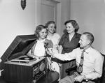Arlos L. Gilbreth, right, the new manager of the Tarrant County Chapter of the American Red Cross, liked to cut his own records as a hobby. On his arrival in Fort Worth, he is shown having gathered his family around to voice their opinions on their new home. Left to right, the image shows Arlin Ann, 11,; Marilyn, 15; Mrs. Gilbreth; and Mr. Gilbreth. Published in the morning edition, September 3, 1950.