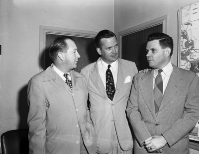 W. C. Newberg of Dayton Ohio, center, president of the Air Temp Division of the Chrysler Corporation, visited Fort Worth with officials of Air Accessories Incorporated, including B. J. Anthis, left, vice president, and W. I. Spitler, right, president. Published in the morning edition, September 2, 1950.