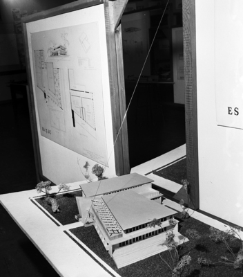 Image show a model student center created by Marion Smith, of Fort Worth. Second year architecture students at Arlington State College (ASC) were assigned to create scale models of a student center for their final project, with some of the models, including the one created by Miss Smith, put on exhibition in the student architectural design show at the Fort Worth Public Library gallery. Published in the morning edition, September 10, 1950.